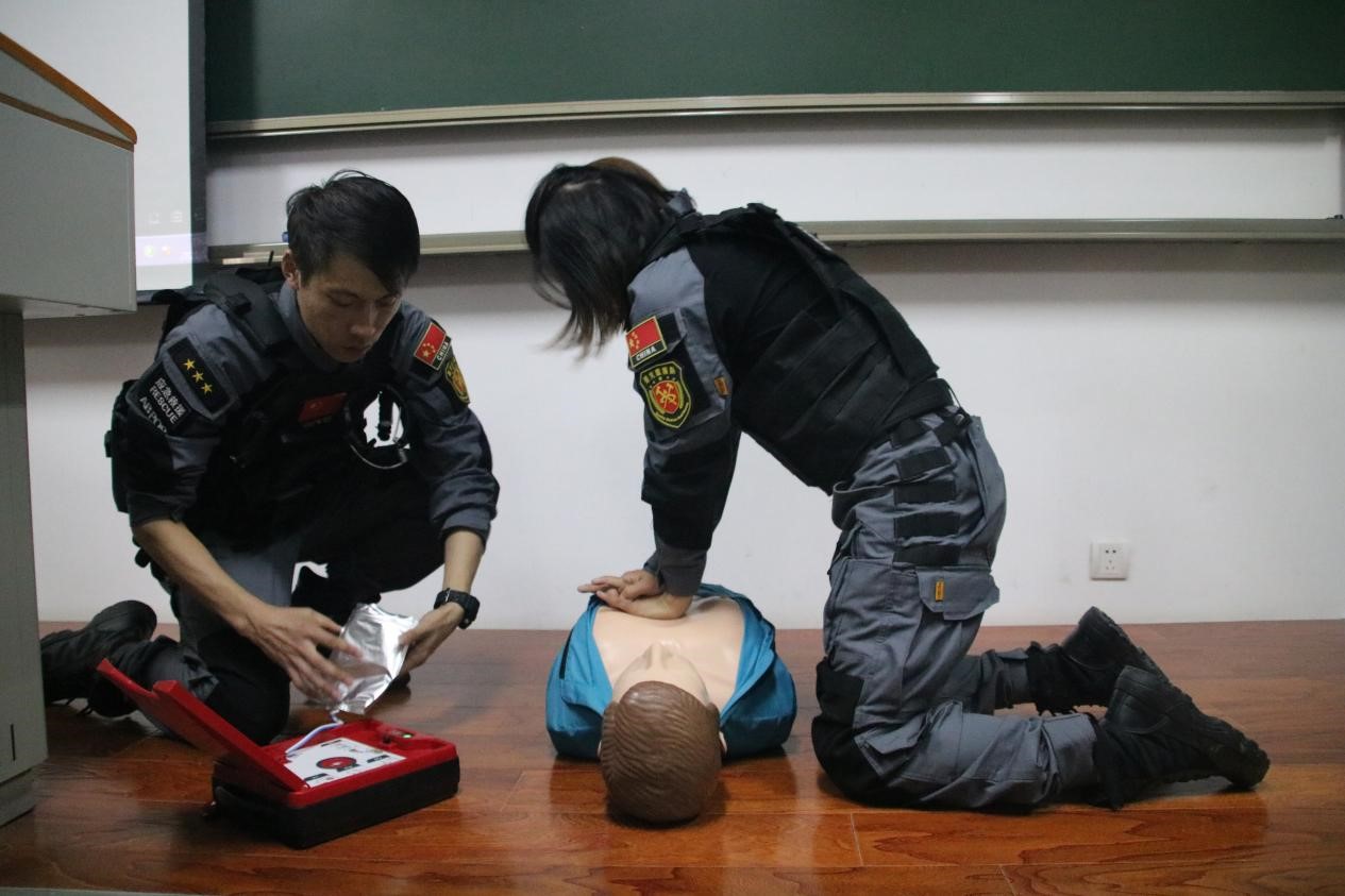 随后,华龙详细讲述了CPR心肺复苏技术理论知识及详细操作步骤,使用人形模型进行详细演示。张祎然向同学们进行半自动体外除颤仪 (AED)原理讲解,使用AED模拟机进行操作分析。最后,讲座现场进行了急救实操演练,在培训员的指导下,同学们学习使用半自动体外除颤仪。博雅教育系列讲座第五期——“绷紧安全弦”公共安全知识讲座顺利结束。