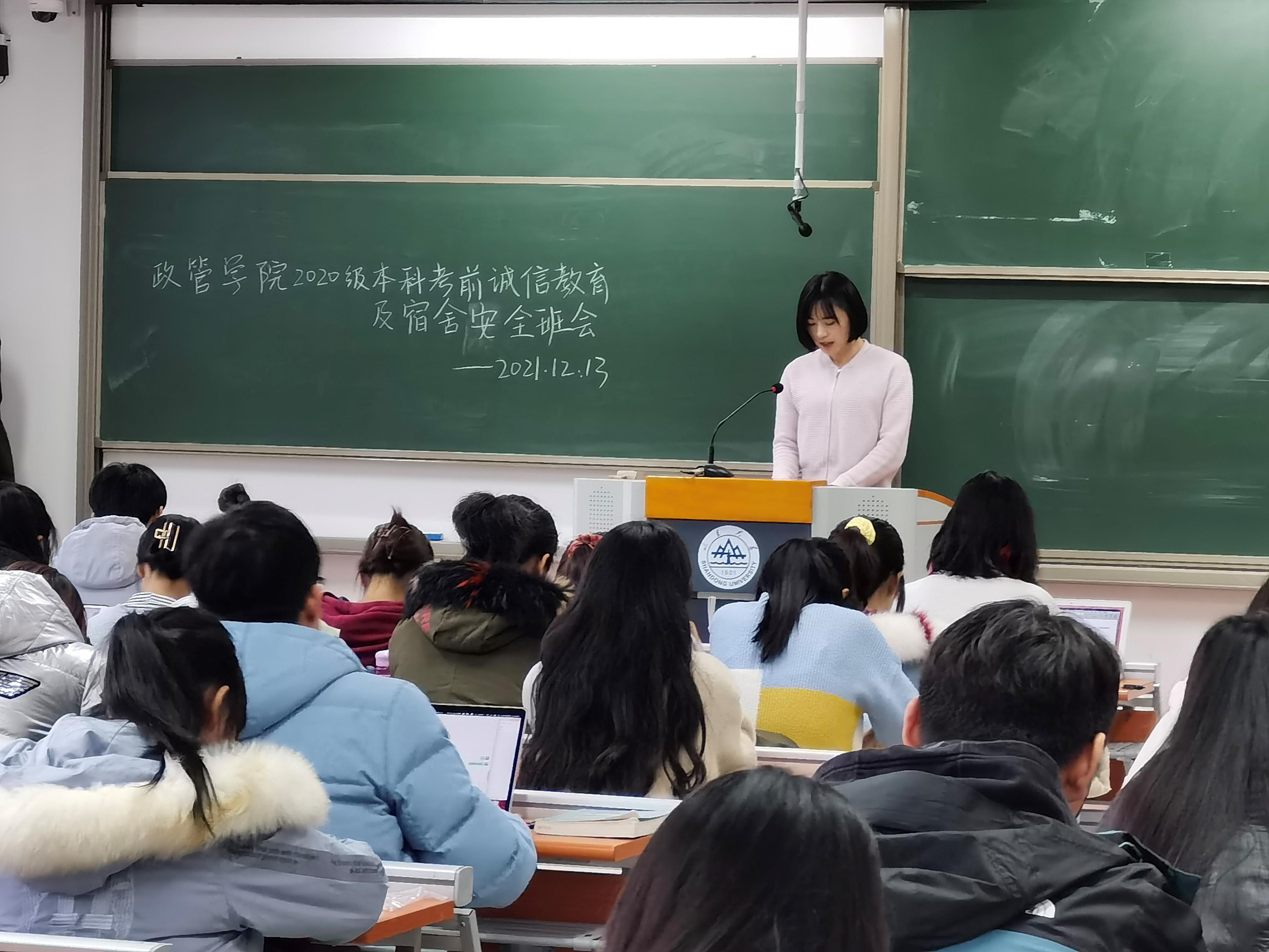 为确保期末各项工作顺利开展,督促学生们认真投入期末复习,保持优良学风,提高学生诚信意识,12月13日,滚球买球的app官网举办2020级本科开展考前诚信教育暨宿舍安全班会。班会由辅导员臧丽丽主持,滚球买球的app官网2020级全体本科生参加。