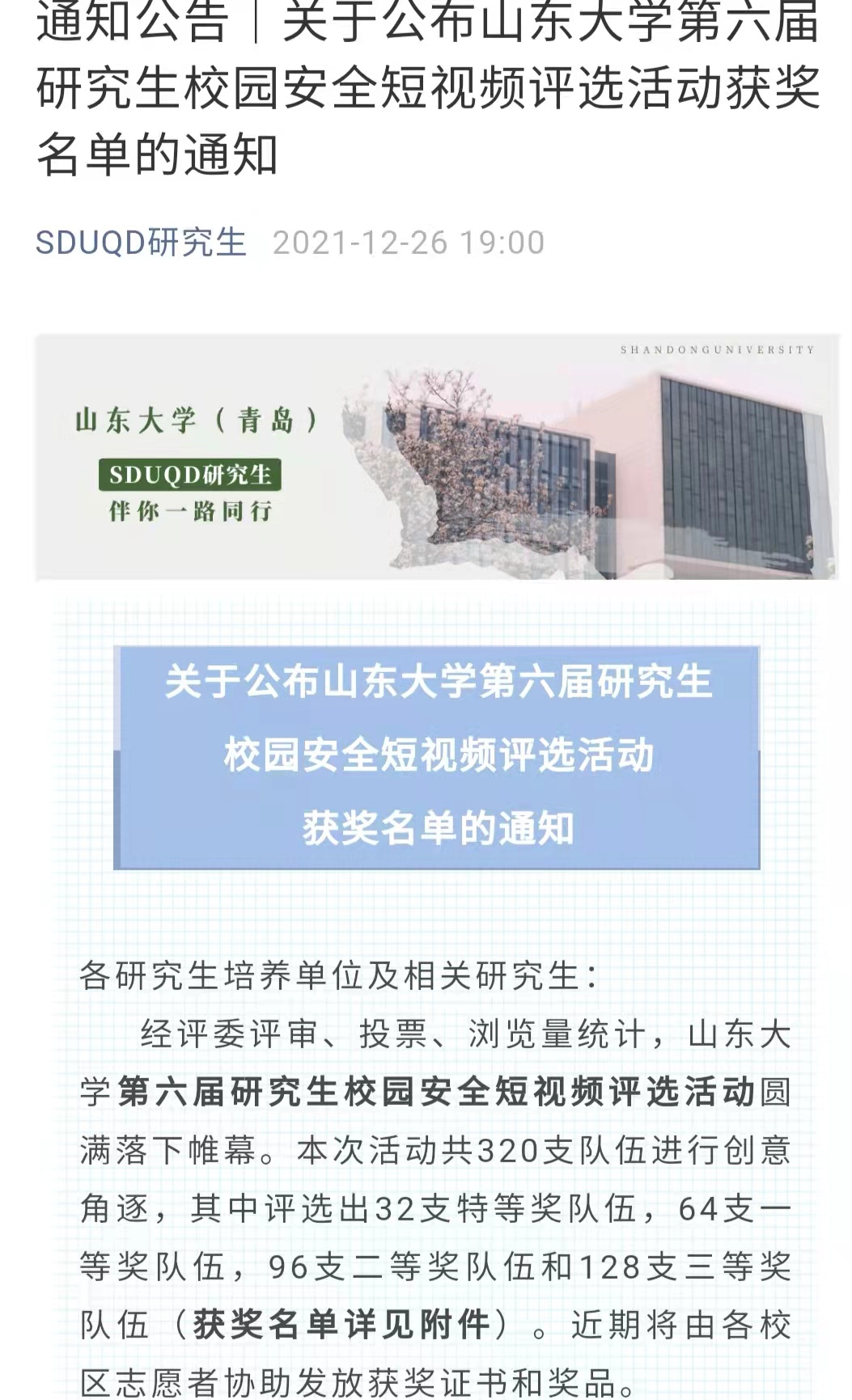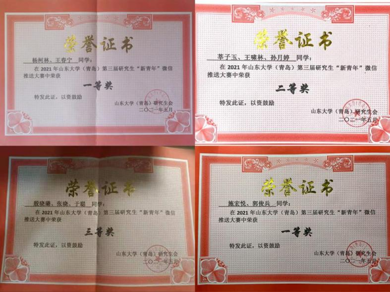1、在滚球买球的app官网(青岛)第三届研究生“新青年”微信推送大赛中,我院杨柯林和施宏悦两个团队获一等奖,莘子玉团队获二等奖,殷晓璐团队获三等奖;