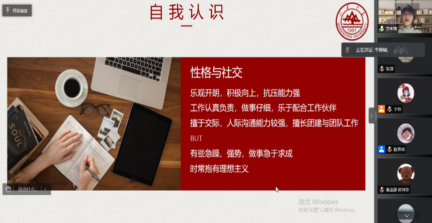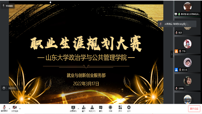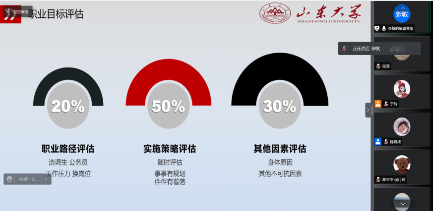 应防疫政策要求,本次大赛采取线上开展的形式。比赛分为个人展示和答辩两个环节。在个人展示环节中,选手们通过理性分析自身的性格、兴趣、价值观等特质,充分利用相关专业知识认真探索职业世界,并将自我认知与职业认知相结合,对未来的职业生涯进行了近期、中期、长期的规划。在答辩环节中,评委们根据选手的职业规划提出相应的问题,并为选手的相关困惑给予了专业建议。本次大赛同时提供线上观赛渠道,多名同学在线观赛,使得同学们对职业生涯规划有了更清晰的认识。