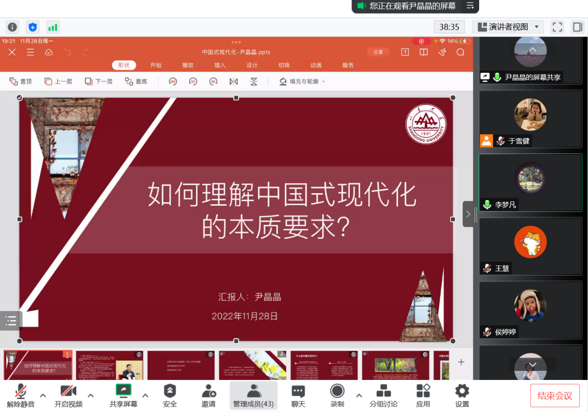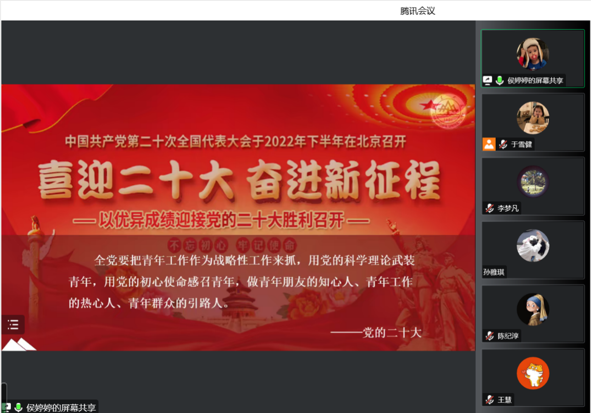 为深入学习宣传贯彻党的二十大精神,提高同学们的思想政治素质和政策理论水平,进一步坚定跟党走中国特色社会主义路的信念,滚球买球的app官网2021级管理类硕研团支部于11月28日通过线上方式举办了“团课我来讲——学习二十大、奋进新征程”主题团日活动,支部全体团员到场参与学习。