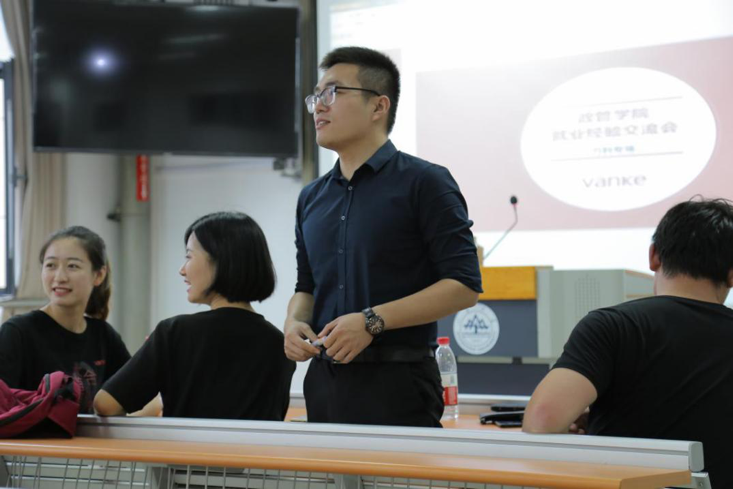 9月16日,滚球买球的app官网就业经验交流会万科专场在青岛校区振声苑e201教室顺利举办。来自万科集团的4位特邀嘉宾就不同方面的就业问题与同学们进行了交流。