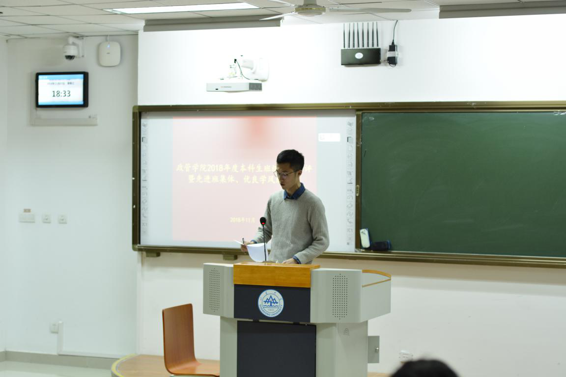 晚上18:30,考评会正式开始。每个班级按照抽签顺序依次上台进行展示,以PPT、视频或表演等丰富多彩的形式从班级情况、学术创新、志愿服务、文体活动、优秀学子等全方面展现了班级风采。“有公德、善勤学、勇创新、善笃行”的15级政行,“聚是一团火,散是满天心”的15级科社,作为毕业班的他们展现了各自的班级特色及就业去向。“行涉政路,管济民心”的16级行管,打造“家”文化的16级政科,用隆中对的表演展示班级风貌的16级公管,用朗诵展现班级每个学子特点的16级国政,作为中坚力量的16级展现了各班丰硕的工作成果。17级公管和政治也创新开展了各具特色的活动。各个班级展现了一学年取得的累累硕果,体现了班级团结友爱争先的精神风貌。评委们在场下仔细聆听每个班级的汇报,力求做到公平公正的打分。