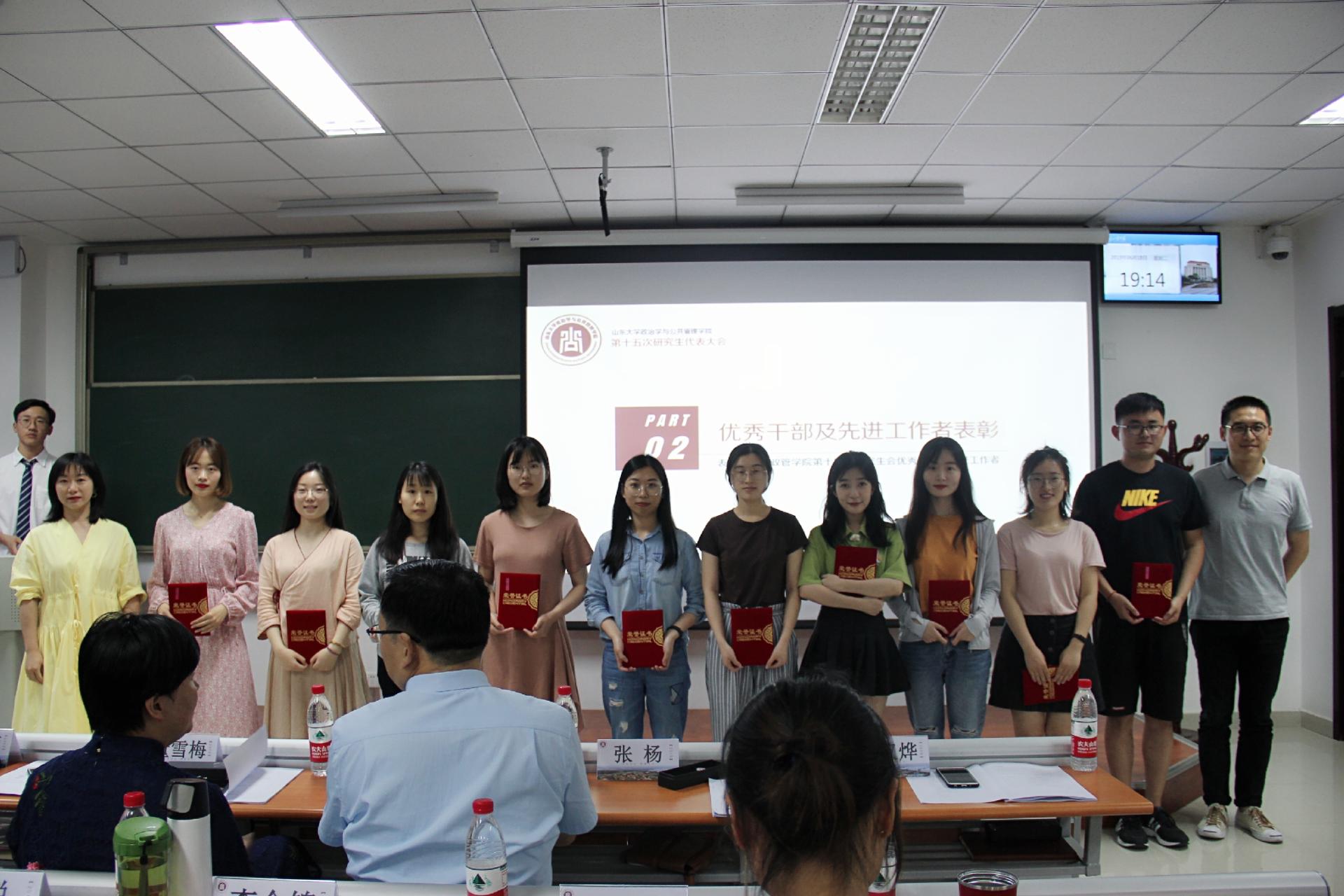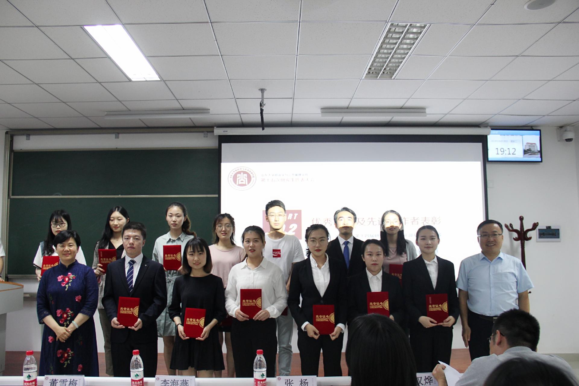 第十四届研究生会主席许光亚同学进行了第十四届研究生会工作报告,对过去一年研究生会工作进行了总结和回顾。经过现场审议和表决,工作报告获得一致通过。同时,大会对第十四届研究生会优秀学生干部和先进工作个人予以表彰并颁发证书。