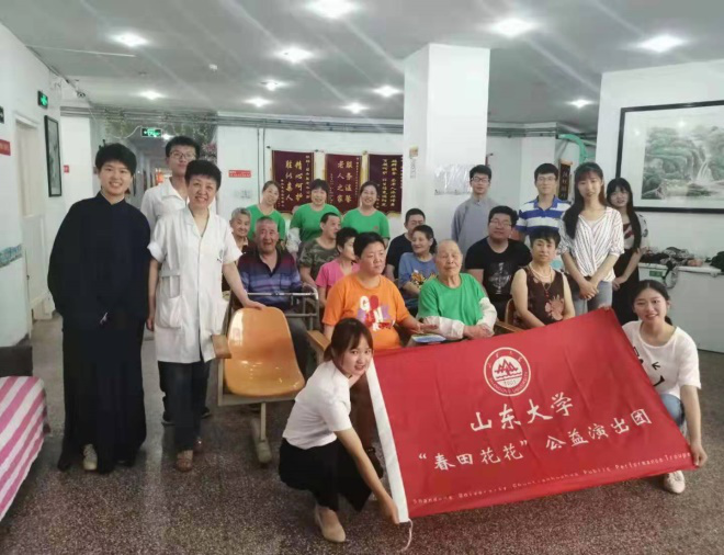 7月15日,团队前往第三站——青岛市市北区乐宁居老年公寓进行演出。团队受到了院方的热情接待。演出结束后,团队与老人进行合影留念。