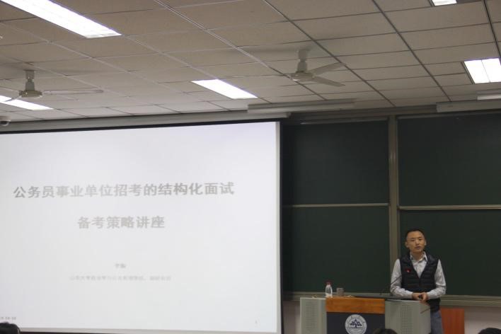 李振老师曾在党政机关任职,目前主要从事中国政府与政治领域的研究,特别专注于中国的干部问题和健康政策问题。基于李老师丰富的理论知识储备和实战经验,此次讲座干货满满,幽默生动。首先,李老师对各个层级的公务员职位和隶属系统进行了详细介绍,帮助同学们了解岗位、定位自身,进行基本的职业生涯规划。随后,他非常全面地介绍了结构化面试的考核目的、面试流程、必备素质和需要注意的细节,帮助同学们全方位了解结构化面试的考察重点,并以几个典型的面试情景为例,向同学们分享了对应的答题模板和面试技巧。最后,李振老师建议同学们将公务员考试内容与专业知识、生活经验阅历有效结合起来,多关注时事政治,多组织模拟面试,培养语感词感,形成“考试记忆”,这样才能在公务员和事业单位考试面试中更加游刃有余。