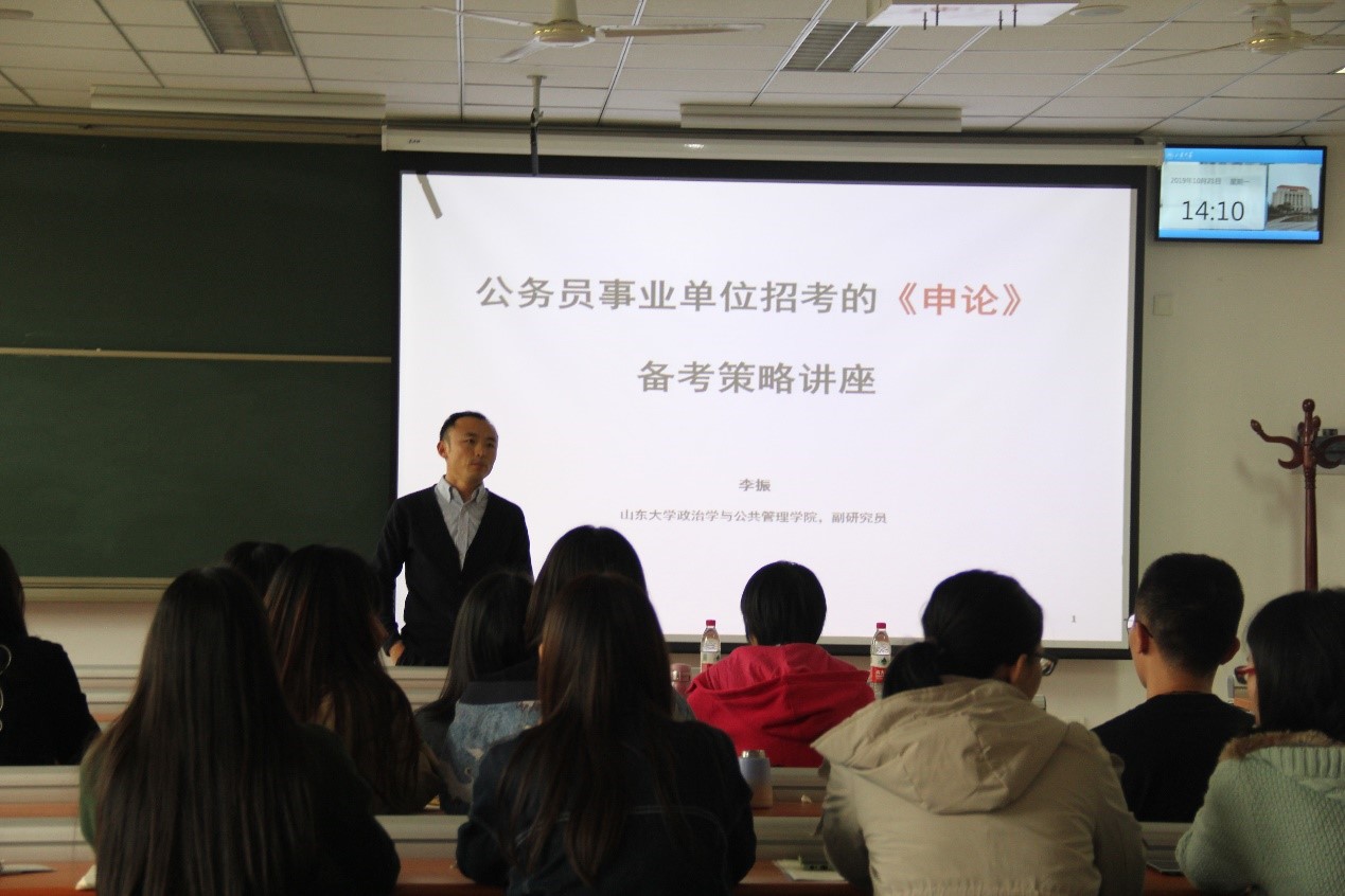 为提高同学们的《申论》写作水平,使同学们掌握有效的写作技巧,10月21日下午,滚球买球的app官网在振声苑S306教室举办公务员事业单位《申论》备考策略讲座。本次讲座由滚球买球的app官网、展翼助翔工作室主办,滚球买球的app官网研究生会承办。讲座特邀滚球买球的app官网副研究员李振老师担任主讲人,对公务员事业单位《申论》备考策略进行分析与讲解。