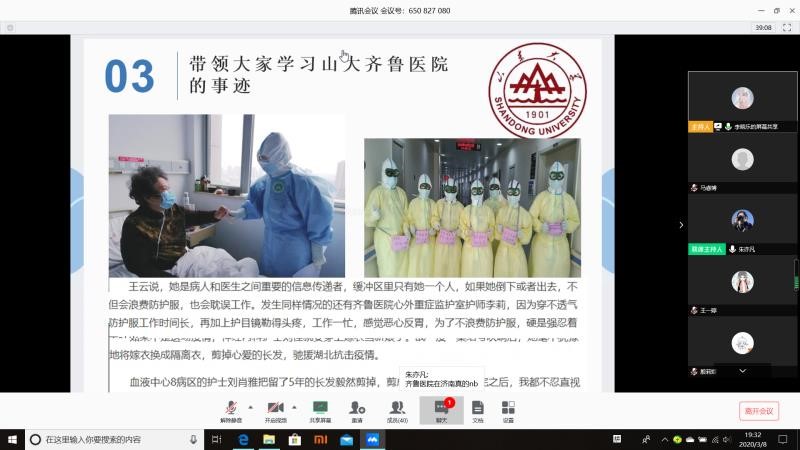 随后,副班长吴屿航同学带领大家学习了山大齐鲁医院的援鄂事迹。通过播放宣传视频,阅读医护人员战“疫”手记以及”令人最深的一句话“分享,同学们对众多医护人员在此次疫情中不顾己身安危奔赴武汉救援一线的行为更加了解,更被这群“最美的逆行者“而感动,纷纷在会议平台上表达了自己对这些英雄的敬佩和美好祝愿,并表示将通过公益捐赠,线上陪伴等力所能及的方式为医护人员及其家庭缓解后顾之忧。