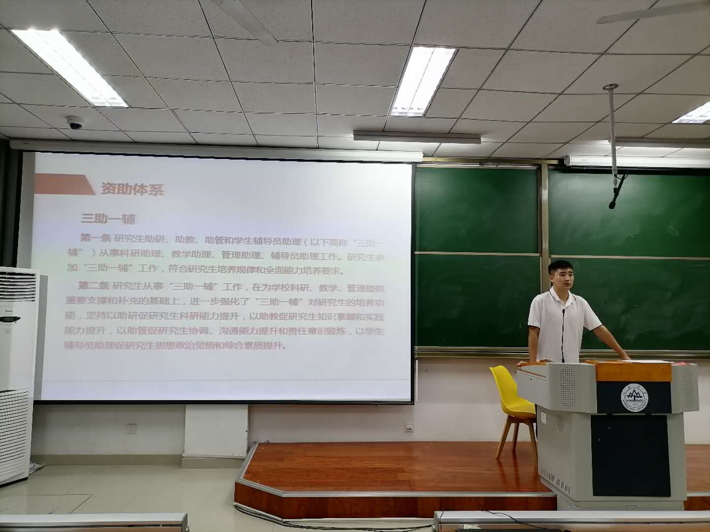 学院2020级研究生辅导员助理孙先正从安全稳定、班级管理、学生违纪处分实施细则、奖助体系四个方面介绍了与大家密切相关的学校管理制度和注意事项。他提醒大家既要保证自身健康安全、严格遵守学生管理规定,又要了解三助一辅等奖助体系,针对性地发展提高自己。