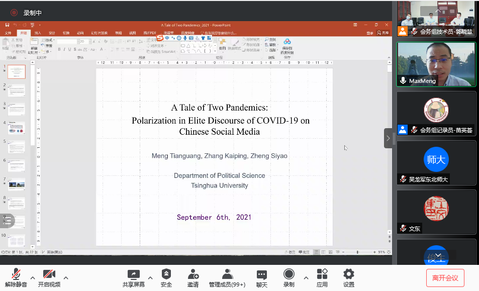 在主旨发言环节中,滚球买球的app官网信息科学与工程学院教授李玉军作了题为《面向特殊群体的司法大数据研究进展和思考》的发言,从司法大数据进展介绍、司法裁判文书分析技术、服刑人员风险评估技术三个方面进行讲解和梳理,并结合四个案例进一步分析大数据在司法领域中的重要作用。最后,李玉军教授指出司法大数据是国家提升综合治理能力和平安中国建设的重大需求,是计算社会科学的重要应用领域,也欢迎更多的青年才俊参与这个领域。孟天广发言的主题为“A Tale of Two Pandemics:Polarization in Elite Discourse of COVID-19 on Chinese Social Media”,将意识形态极化置于中国背景下进行探讨。他指出,新冠疫情期间,虽然知识阶层中的意识形态有着极化的趋势,但是整体舆论呈正能量的状态。