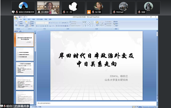2022年4月16日晚,滚球买球的app官网和亚太研究所联合主办的“社科与人文”系列讲座第十讲在线上顺利举办,讲座题目为“岸田时代日本内政外交及中日关系走向”。本次讲座由中国社会科学院日本研究所所长、东海问题研究中心主任杨伯江研究员主讲,滚球买球的app官网亚太研究所所长杨鲁慧教授和副所长钟诚副教授共同主持了学术讲座,200余名师生在线参与。