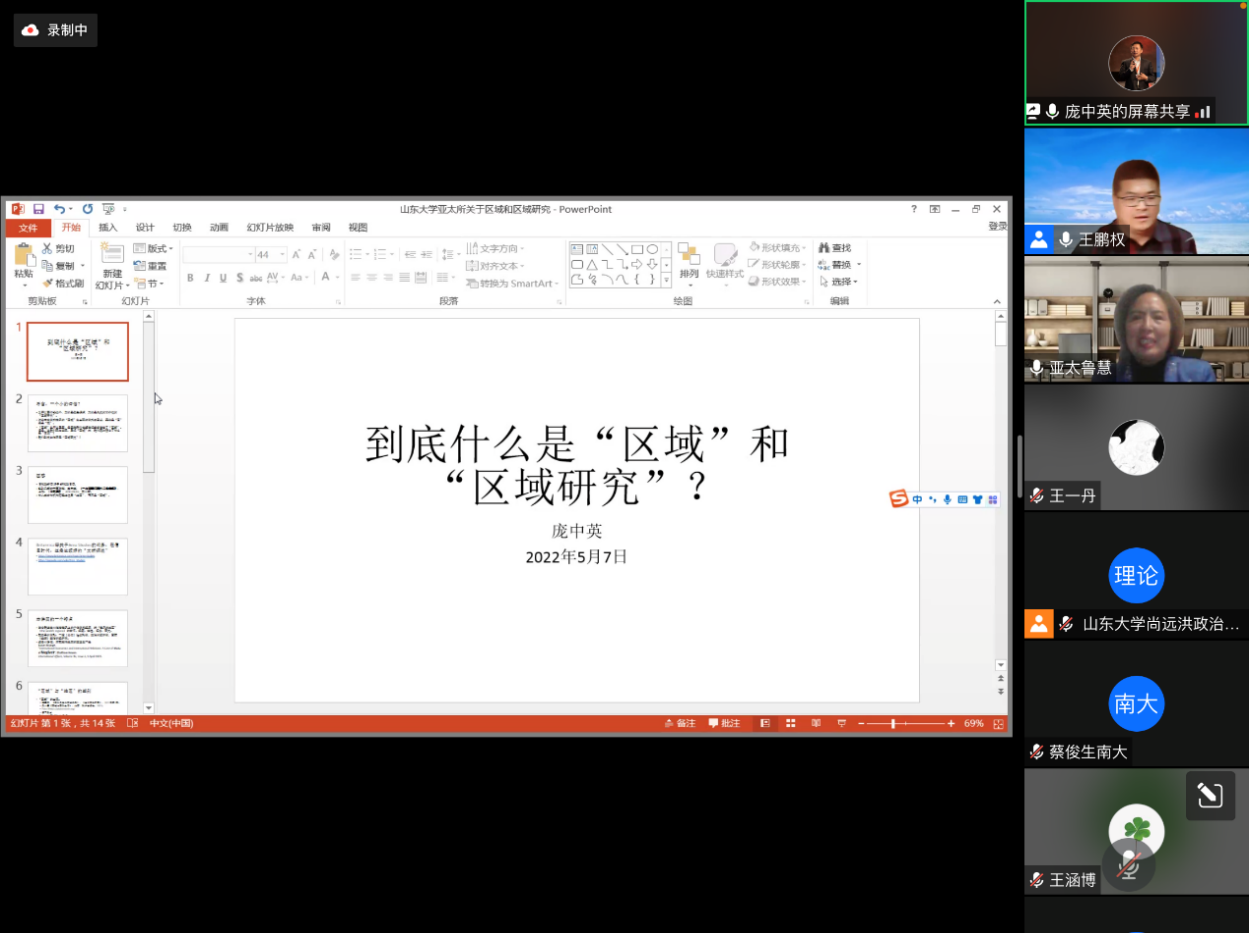 2022年5月7日晚,由滚球买球的app官网、亚太研究所联合主办,亚太研究所大国关系与地区安全研究中心承办的“社科与人文”系列讲座第十一讲在线上顺利举办,讲座题目为“到底什么是‘区域’和‘区域研究’”。本次讲座由中国海洋大学特聘教授、海洋发展研究院院长庞中英主讲,主持人为亚太研究所大国关系与地区安全研究中心主任王鹏权博士,亚太研究所副所长赵玙佳副教授、亚太研究所地区环境与中国周边外交研究中心主任李昕蕾教授担任与谈人。