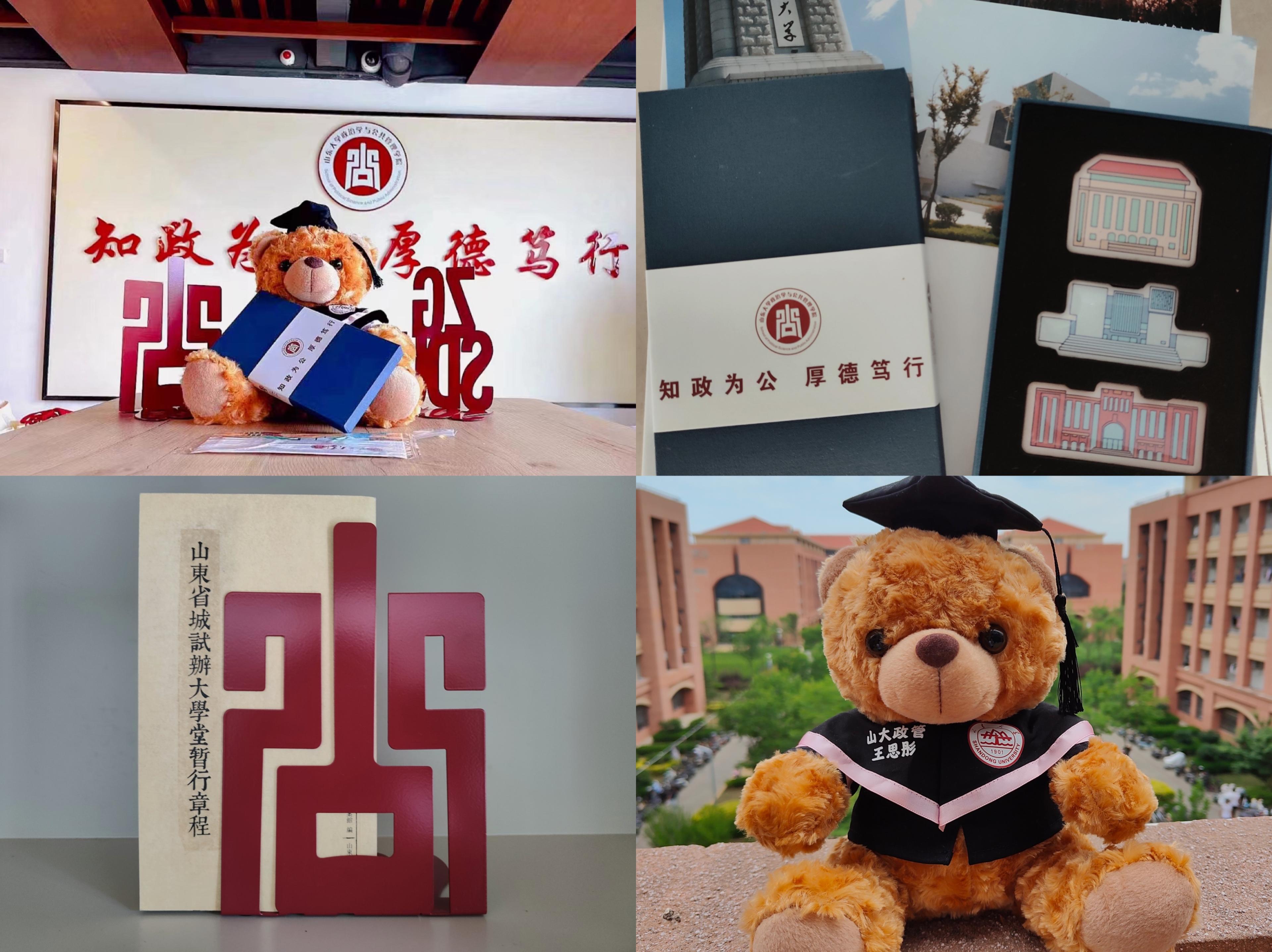 学院传承礼仪之邦的古老传统,特意准备系列纪念品,赠予毕业生,表达深厚的祝福之情。本科毕业生们收到的是一只小毕业熊、一本《山东省城试办大学堂暂行章程》、一套明信片和印有山大标志性建筑的冰箱贴,表达出保持纯真、勿忘母校的美好愿望;一支校友帆布包、一件学士服、一把伞、一个小印章,则表达出对硕士毕业生前途似锦、来日方长的衷心祝愿,毕业并不意味着分别,而是期待下一次更好的相遇。