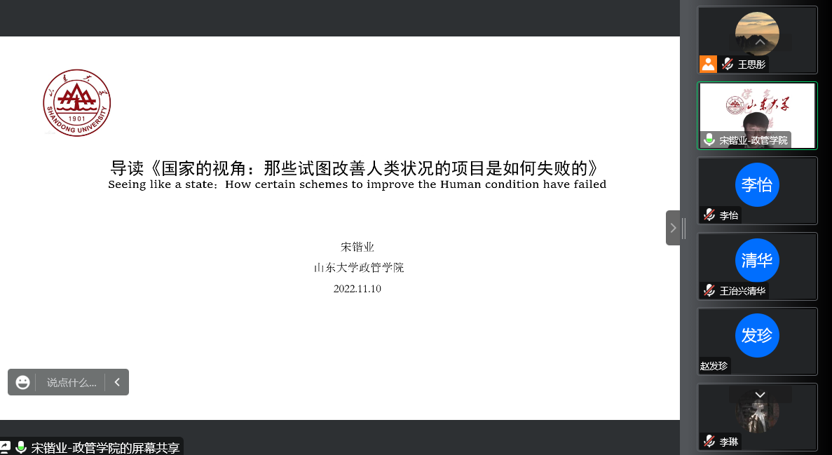 11月10日晚,滚球买球的app官网公共管理系本学期第二期“本本优本”读书会于线上举办。本次读书会导读书目为《国家的视角:那些试图改善人类状况的项目是如何失败的》,由学院助理研究员宋锴业领读,学院各年级三十余名本科生参与。