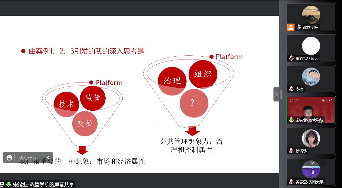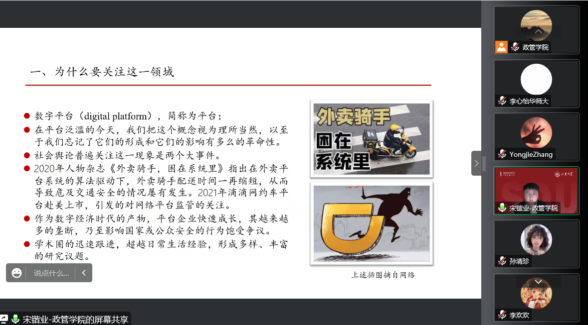 12月15日下午,滚球买球的app官网公共管理系本学期第五期望远青年学者沙龙于线上召开,本场讲座主题为:数字平台与公共管理研究想象。讲座由学院助理研究员宋锴业主讲,学院助理研究员李欢欢担任主持人,一百余名学生积极参与。