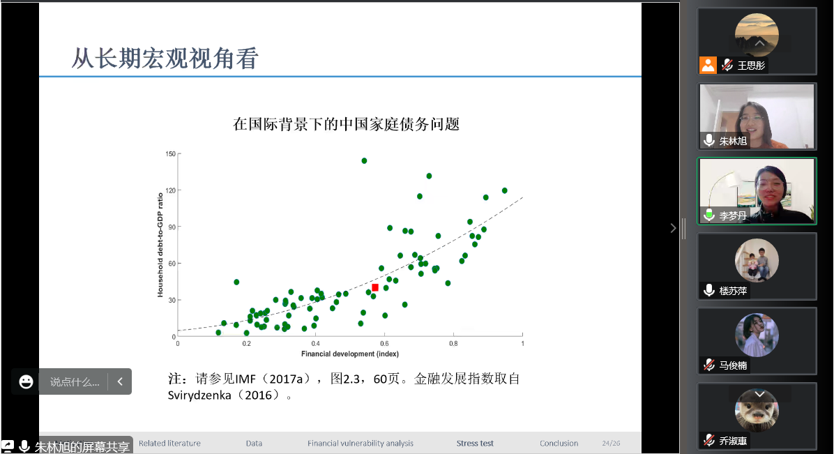 讲座伊始,朱林旭指出,家庭信用风险是金融稳定的基础与前提。朱林旭意在从微观层面研究中国家庭的财务脆弱性,对其家庭债务分配、债务偿还能力及应对冲击的抵抗能力进行评估,以更加准确地了解中国家庭债务的可持续性。朱林旭借助前三轮中国家庭金融调查数据,分析了在中国家庭的不同收入群体间,债务和财务问题如何分布,及如何随着时间推移发生变化。朱林旭强调,虽然宏观视角下中国家庭的金融风险较低,但通过微观数据进行压力测试发现,中国大量低收入家庭的财务状况脆弱性较高,可能面临难以履行承诺的状况,应通过进一步金融改革来加强监管与风险管控。讲座最后,与会师生就讲座内容展开讨论。