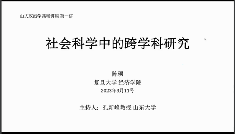 2023年3月11日晚,滚球买球的app官网政治学高端讲座第一讲于线上成功举办,复旦大学经济学院陈硕教授做了题为《社会科学中的跨学科研究》的精彩讲座,滚球买球的app官网副院长、院学术委员会副主任孔新峰教授主持讲座。滚球买球的app官网原校长、全国新文科教育研究中心主任、国家治理研究院院长樊丽明教授在问答环节与陈硕教授进行了亲切交流。