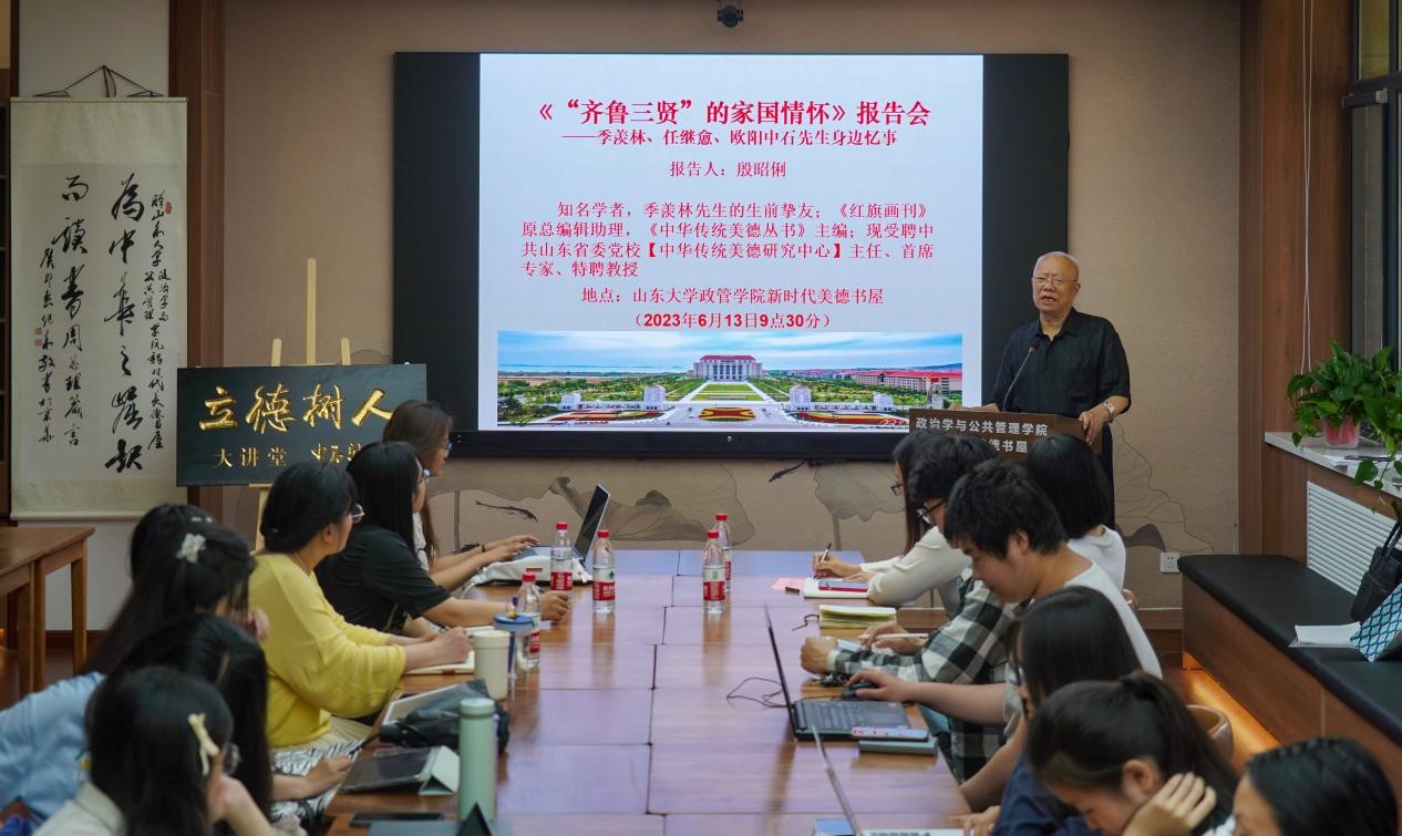 殷教授首先指出,立德树人是教育的根本任务。然后由“其旨远,其辞文”地讲好中国故事引入,向大家讲述了季羡林、任继愈、欧阳中石“齐鲁三贤”在艰难困苦的情况下,立德树人,终其一生为国为民奉献的故事。