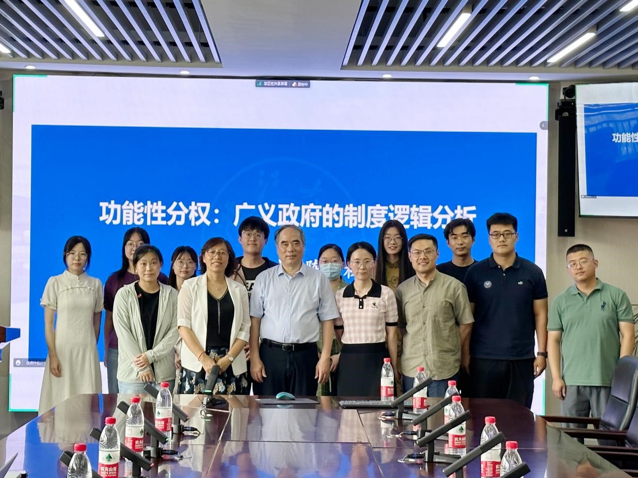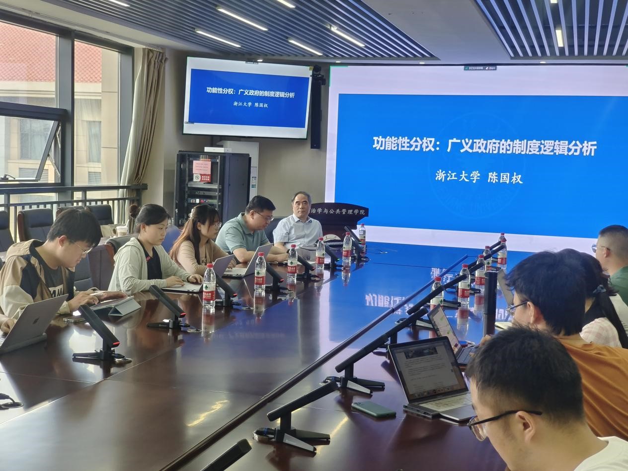 7月3日上午,滚球买球的app官网公共管理系2022-2023学年春季学期第十一期望远学术沙龙于华岗苑南楼四楼中厅会议室召开,讲座主题为“功能性分权:广义政府的制度逻辑分析”。本次讲座由浙江大学求是特聘科研岗教授陈国权主讲,滚球买球的app官网常务副院长马奔主持。