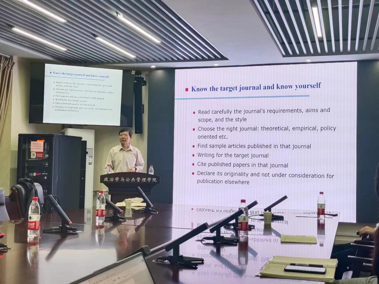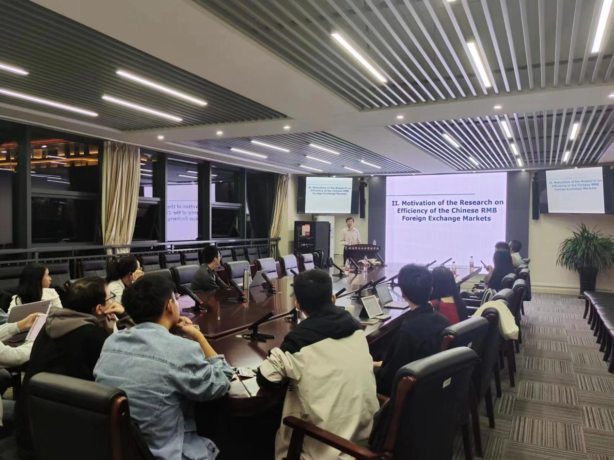讲座伊始,张照勇教授从英文学术论文写作的角度出发,强调论文选题是一个在理论基础上进行从观察到分析的学术过程,论文写作要基于事实、使用专业术语,论文发表要了解目标期刊等。随后,张照勇教授以“中国人民币外汇市场效率研究动因”和“汇率变动不确定性与中国对外直接投资的时机研究”两个研究课题为例,对英文论文的选题与写作过程进行具体讲解,从选题背景、研究综述、数据模型、数据分析以及结论提炼等角度向师生介绍了完整的学术研究过程。讲座最后,张照勇教授还从安全的角度分析了这两项研究的政策与政治意义。