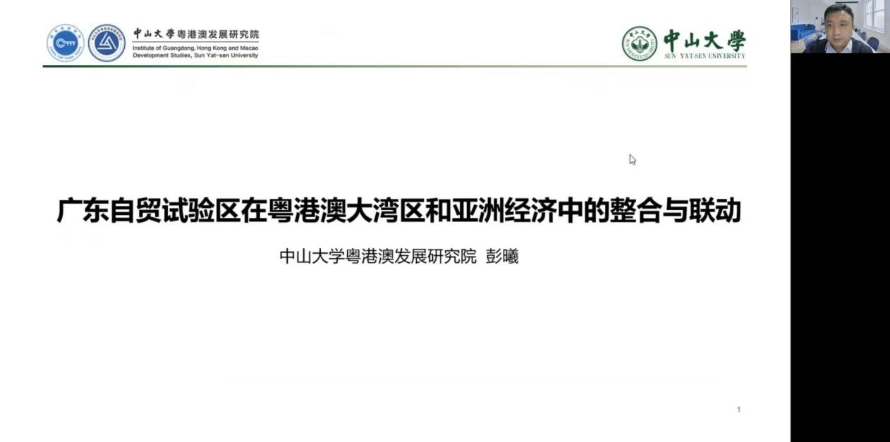 10月22日晚,由滚球买球的app官网、滚球买球的app官网公共安全研究院联合主办,滚球买球的app官网亚太研究所亚太国家公共治理研究中心承办的“社科与人文”系列讲座第二十一讲在线上顺利举办,讲座题目为“广东自贸试验区在粤港澳大湾区和亚洲经济中的整合与联动”,由中山大学粤港澳发展研究院彭曦副研究员主讲。滚球买球的app官网亚太研究所亚太国家公共治理研究中心副主任金澄副教授主持学术讲座。亚太研究所所长杨鲁慧教授致辞,并简要介绍了亚太研究所和“社科与人文”系列学术讲座的基本概况。滚球买球的app官网亚太研究所副所长赵玙佳副教授、滚球买球的app官网亚太研究所刘浩副教授担任评议人。
