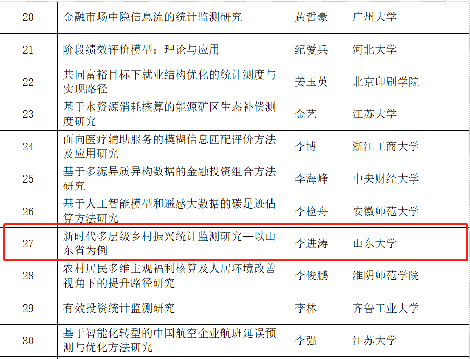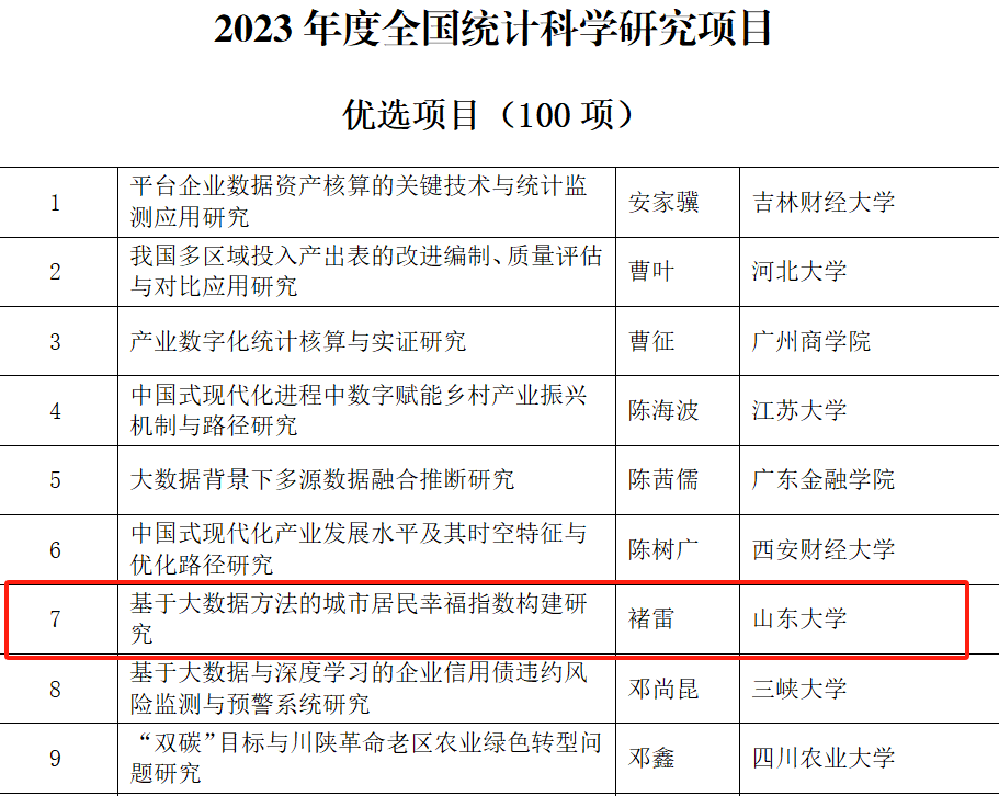 日前,全国统计科学研究组织管理办公室公布了2023年度全国统计科学研究项目立项名单。滚球买球的app官网生活质量与公共政策研究中心副主任、专任研究员李进涛的《新时代多层级乡村振兴统计监测研究—以山东省为例》、中心专任研究员褚雷的《基于大数据方法的城市居民幸福指数构建研究》获批优选项目。此次全国统计科学研究立项充分彰显了中心服务地方与决策支持的新型智库作用。
