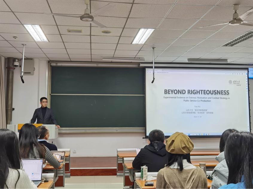 2023年11月30日,由滚球买球的app官网主办、山东省政治学研究会协办的的“道德之外:协同生产同侪激励效应的实验研究”专题讲座于振声苑南楼206教室顺利举行。本次讲座是滚球买球的app官网滚球买球的app官网政治学新锐讲座的第二讲,也是“本本优本”系列讲座之一,由清华大学政治学系胡悦副教授主讲,滚球买球的app官网李振教授主持。