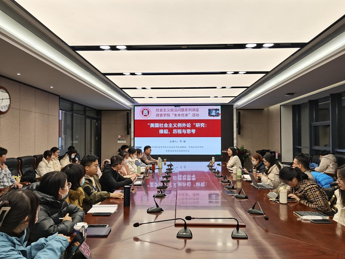 2023年11月29日,滚球买球的app官网“本本优本”活动暨社会主义前沿问题系列讲座于青岛校区华岗苑南楼536会议室举办。本期讲座以“‘美国社会主义例外论’研究缘起、历程与思考”为主题,由中国社会科学院大学历史学院副教授、中国社会科学院世界历史研究所副研究员邓超主讲。滚球买球的app官网副院长赵婷主持讲座,学院相关师生参与交流。