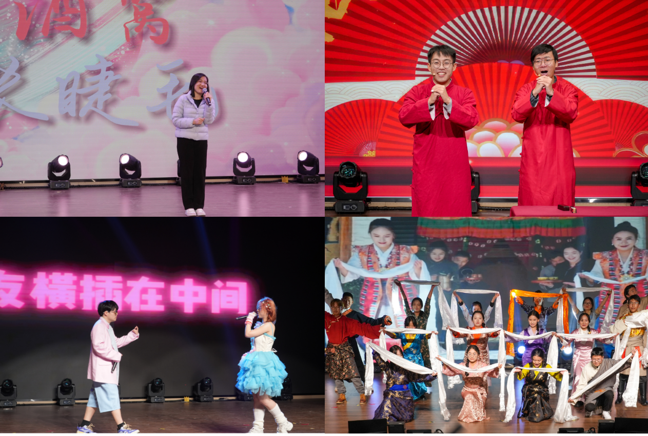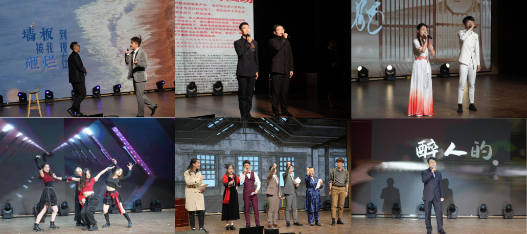 本场晚会共分为“青春:青春盛景,万象启新”“担当:奋楫笃行,赓续华章”“家国:风禾尽起,海晏河清”三个篇章。通过歌曲、舞蹈、器乐演奏、小品、相声、朗诵等丰富的艺术形式,展现我院师生朝气蓬勃的精神风貌和多姿多彩的校园文化生活。在第一篇章中,由公共管理系朱林旭老师带来的歌曲《小酒窝》旋律动人、浪漫温馨;相声《学评书》妙趣横生、令人捧腹大笑;原创歌曲《新心》青春洋溢,点燃全场气氛;舞蹈《山青藏韵》热情豪迈,洁白哈达献给全体老师,美好祝福传递心间,师生互动其乐融融。