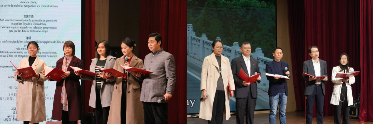 在第三篇章中,演奏《大鱼》带师生感受旋律之美,领略千年沉淀的国风妙音;舞蹈《杯盏念归家》以优美舞姿传递心意,愿杯盏归家、家国永安;歌曲《成全》在动人旋律中找寻成长的意义;学院10位老师用英语、法语、德语、西班牙语、俄罗斯语、日语、韩语带来的朗诵《这就是我,中华人民共和国》让人心潮澎湃,以家国情怀绘就每位滚球买球的app官网最为厚重的底色。