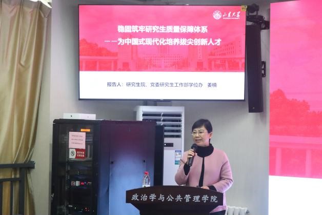 姜楠从学位授权点建设、导师队伍建设和学位授予质量三方面介绍了学校研究生学位论文质量保障体系构建情况,重点结合有关文件规定和近年来学位论文评审统计情况,强调了导师在学位论文指导、评审以及责任问责等方面的工作要求。