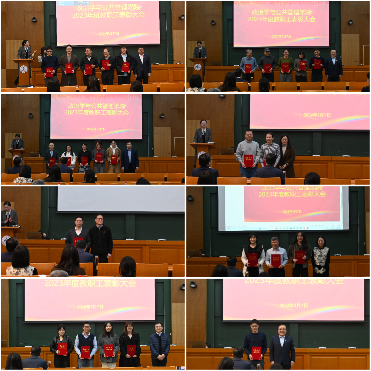 学院2023年度教职工表彰大会隆重表彰了在教书育人、科学研究、管理服务工作中涌现出来的先进集体和个人。学院党委副书记石莹主持表彰大会。大会依次颁发了优秀教师奖、优秀共产党员奖、先进教育工作者奖、优秀党务工作者奖、科研突出贡献奖、文体活动突出表现奖、MPA年度优秀教师奖、MPA年度优秀教育工作者奖以及先进基层组织奖。会议强调,全体教工要以先进典型为榜样,凝心聚力,开拓进取,以更加奋发有为的精神状态,真抓实干的工作作风,在学校“全面图强、争创一流”的新征程中发挥更大作用。