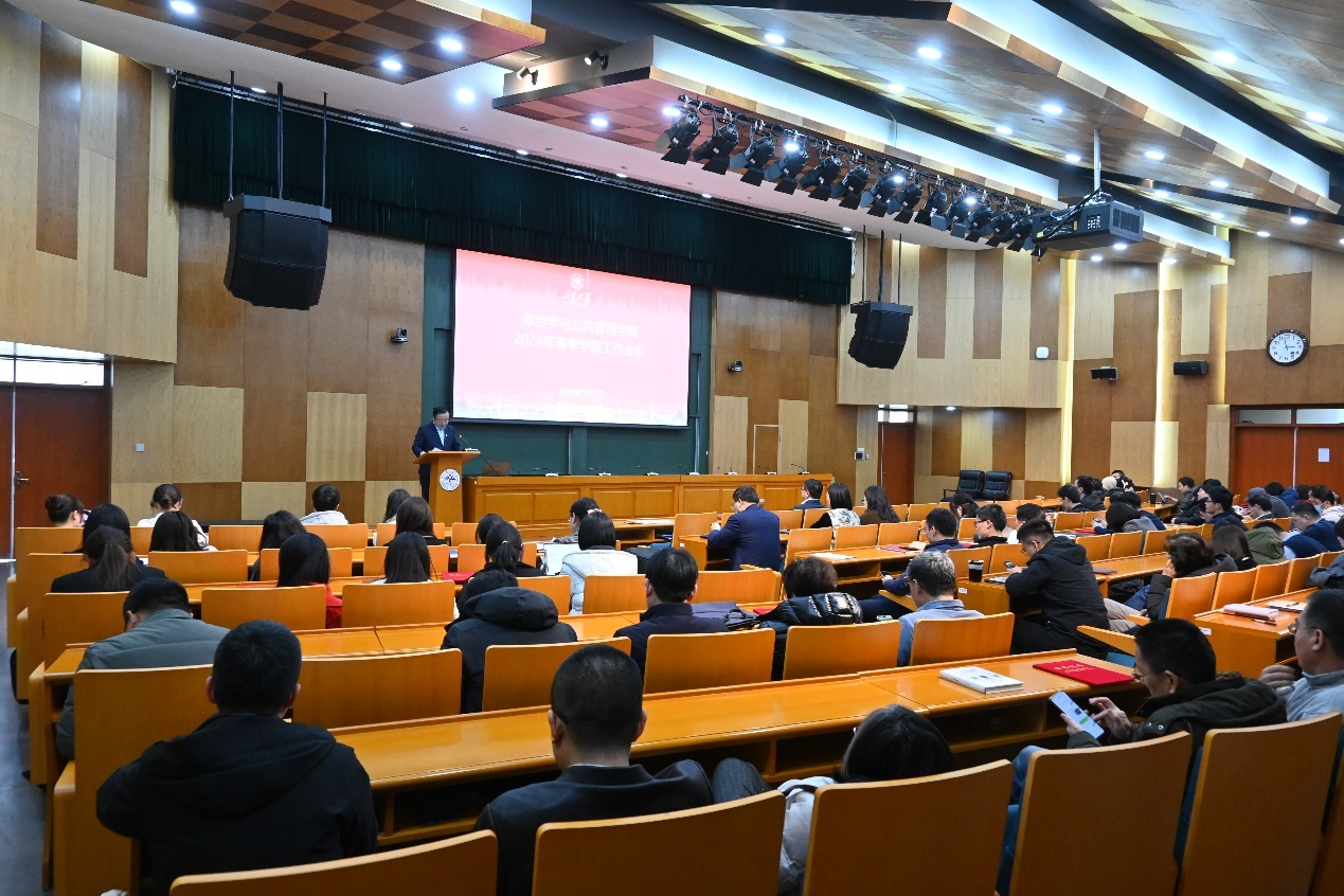 在随后召开的新学期工作会议上,李海燕传达了中共滚球买球的app官网第十四届委员会第十五次全体会议和学校2024年春季学期工作会议的主要精神。会议指出,要以文育人,加强正面宣传,全方位、多维度讲好山大故事、学院故事,展现学院良好精神风貌。会议强调,要增强攻坚克难的精神,增强改革韧劲,持续激发内生动力和创新活力,不断开创学院高质量发展新局面,奋力回答好“强国建设、政管何为”的时代课题。