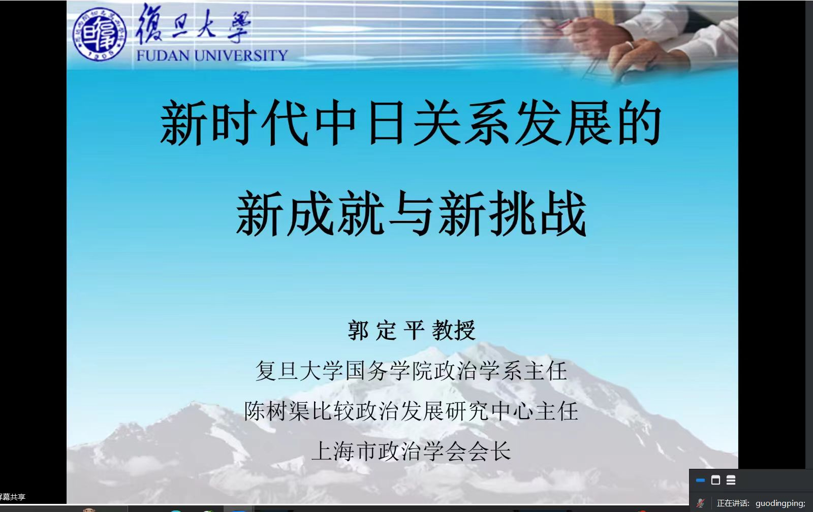 5月29日晚,由滚球买球的app官网主办,滚球买球的app官网亚太研究所/亚太经济合作组织研究中心承办的“社科与人文”系列讲座第二十六讲在线上顺利举办,讲座题目为“新时代中日关系的新成就与新问题”,由复旦大学国际关系与公共事务学院郭定平教授主讲。滚球买球的app官网亚太经济合作组织研究中心执行主任李济时教授主持学术讲座。滚球买球的app官网亚太研究所所长杨鲁慧教授致辞,并简要介绍了亚太研究所和“社科与人文”系列学术讲座的基本概况。亚太研究所副所长赵玙佳副教授、亚太研究所大国关系与地区安全研究中心主任王鹏权副教授担任与谈人。