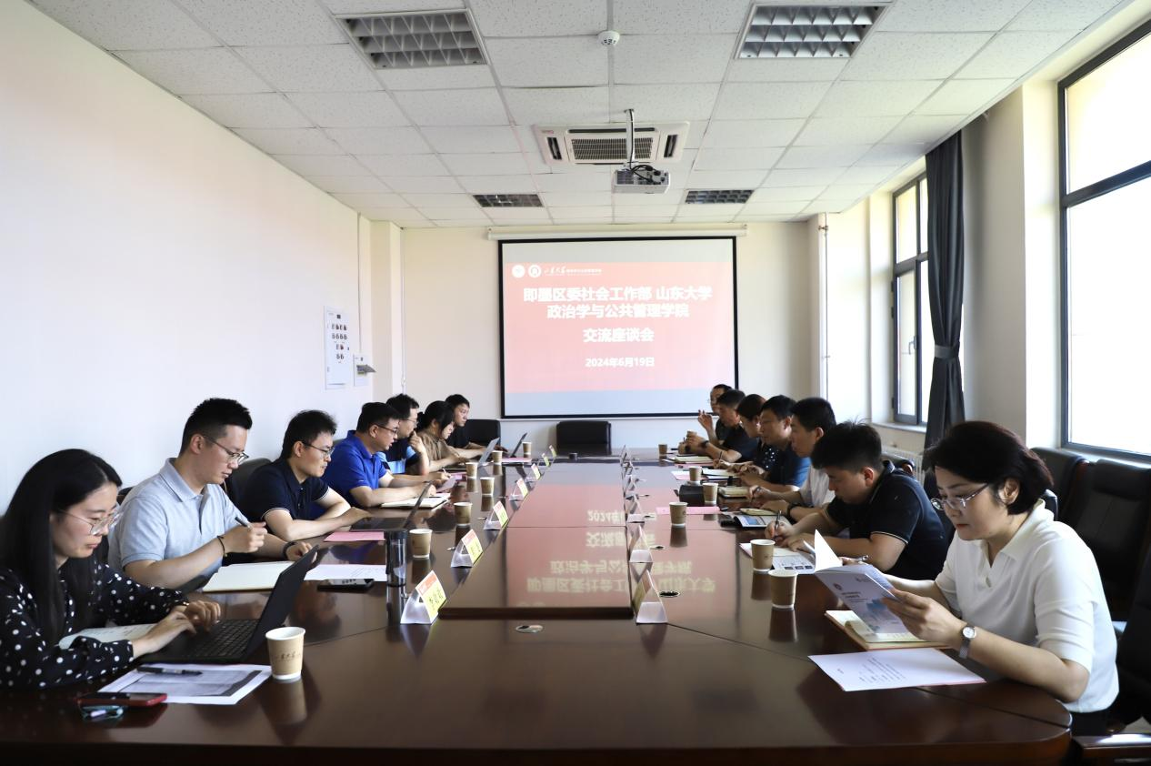6月19日,即墨区委社会工作部与滚球买球的app官网交流座谈会在青岛校区举行。即墨区委政法委分管日常工作的副书记,区委社会工作部部长、“两新”工委书记杨鹏贤,区委社会工作部副部长孙方良等一行7人参与会议。学院院长马奔及教师代表参加座谈交流。