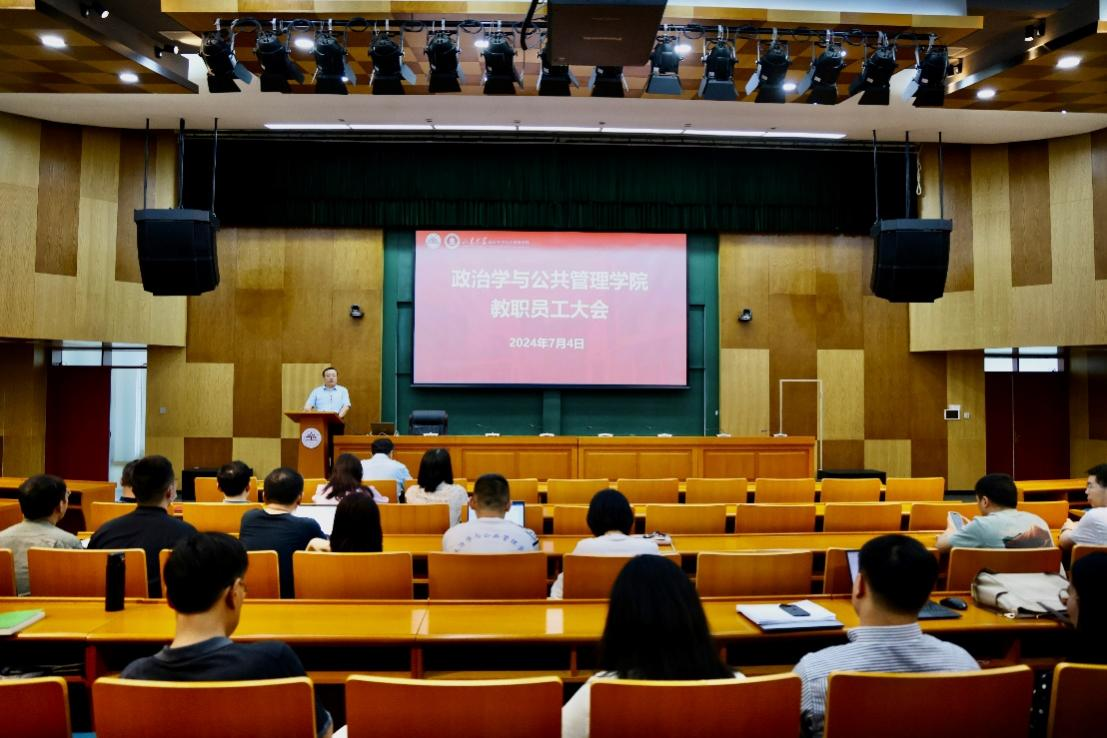 马奔通报了学院上半年各项工作开展情况。他指出,2024年上半年,学院在学校党委和校区党工委领导下,以高质量发展为主题,以立德树人为根本,以学科建设为龙头,以改革创新为动力,持续提升人才培养质量,有力服务治国理政,以“全面图强、争创一流”的扎实行动迎接学校第十五次党代会胜利召开。学院各项事业取得了较快发展,党的领导和党的建设全面加强,科学研究成果丰硕,人才培养成效显著,人才队伍建设稳步推进,国际合作交流持续拓展。随后,结合学校第十五次党代会提出的发展思路,对学院下半年各项重点工作进行了部署。会议强调,要全面学习领会贯彻“一五七九”的发展思路,勇担使命,敢闯敢创,全面图强,推动学院各方面工作取得新成效、实现新突破,为努力建设担当民族复兴大任的世界一流大学贡献政管力量。