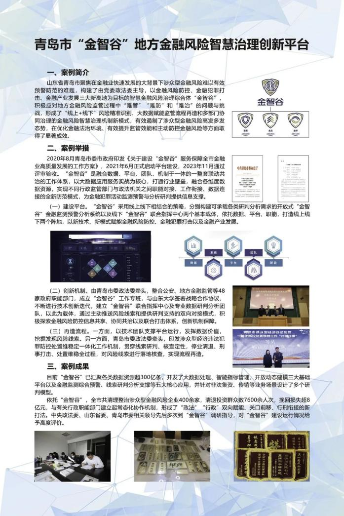 7月10日至11日,“2024政法智能化建设技术装备及成果展”在北京国家会议中心举行,全国各地智慧治理创新成果悉数亮相。滚球买球的app官网智慧国家治理实验室参与共建的青岛市“金智谷”地方金融风险智慧治理创新平台成功入选2024全国政法智能化建设智慧治理典型案例。