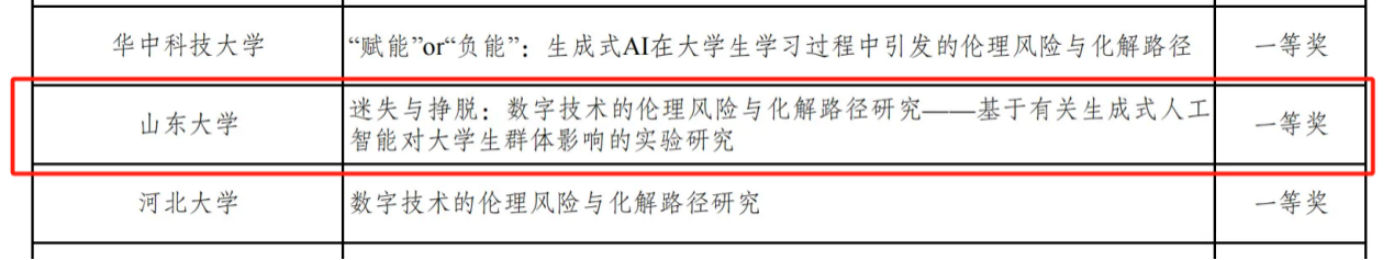 由贾小云、孙宗锋老师指导的王瑞丰、宋康齐、韩清扬等同学组成的团队作品《迷失与挣脱:数字技术的伦理风险与化解路径研究--基于有关生成式人工智能对大学生群体的实验研究》获得一等奖。本项目依托一项有关生成式人工智能对大学生群体的影响实验,探讨生成式人工智能的使用是否会影响到大学生的学习能力呈现与道德素养变化,并进一步从路径依赖下探讨短期-长期数字技术潜在的伦理风险,进而提出应对之道,以期达到数字技术的“合目的性”与“合规律性”的统一。