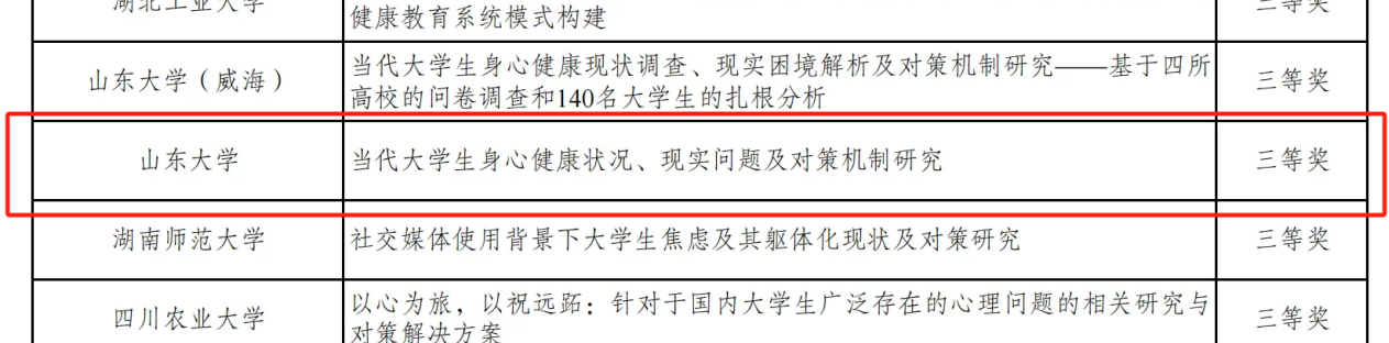 由马桂兰老师指导的王清华、李亚博等同学组成的团队作品《“当代大学生身心健康状况、现实问题及对策机制研究”》获三等奖。项目依照多阶段、分层、随机的抽样原则,在全国范围内展开多阶段抽样调查,全面呈现大学生身心健康状况,细致剖析当前大学生身心健康领域的现实问题,在此基础上,针对性地提出对策建议,以期为我国大学生身心健康全面发展有所助益。