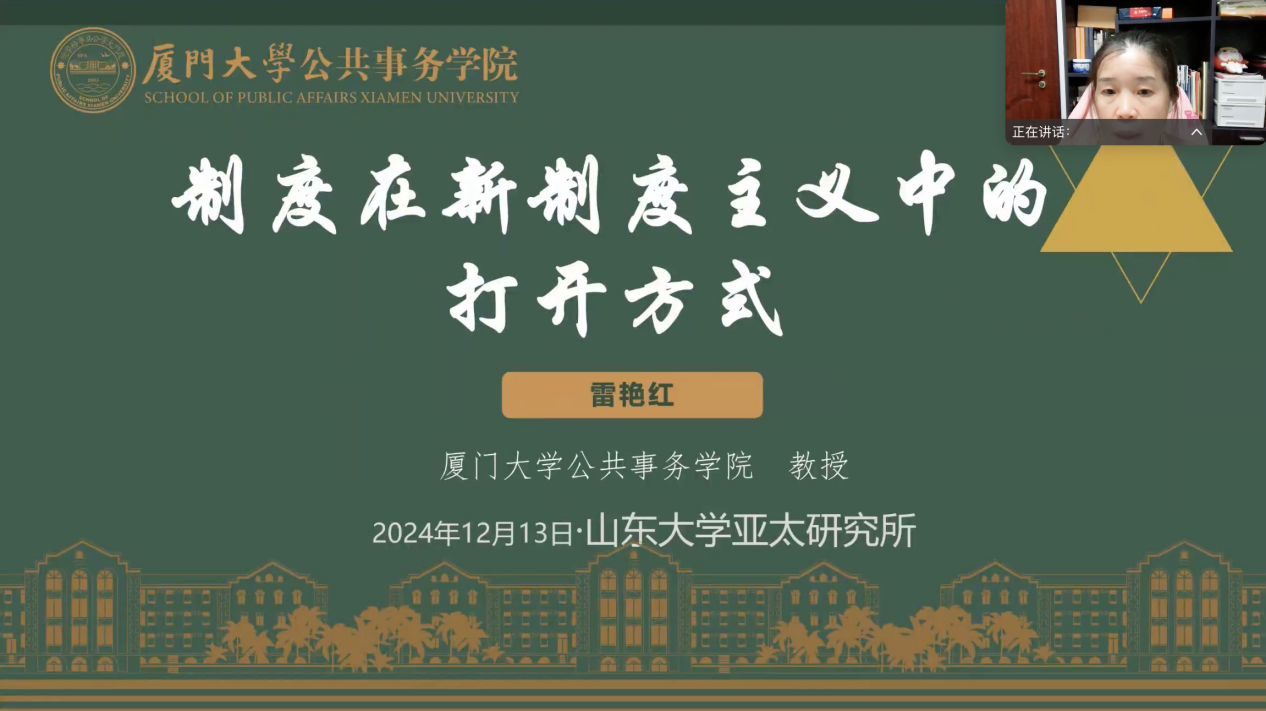 近日,由滚球买球的app官网、滚球买球的app官网亚太研究所主办,亚太所亚太国家社会与人文研究中心承办的“社科与人文”系列讲座第三十一讲在线上举办,讲座题目为“制度在新制度主义中的打开方式”,由厦门大学公共事务学院教授雷艳红主讲,亚太所副所长钟诚主持,滚球买球的app官网亚太经济合作组织研究中心执行主任李济时、亚太所副所长赵玙佳担任与谈人。
