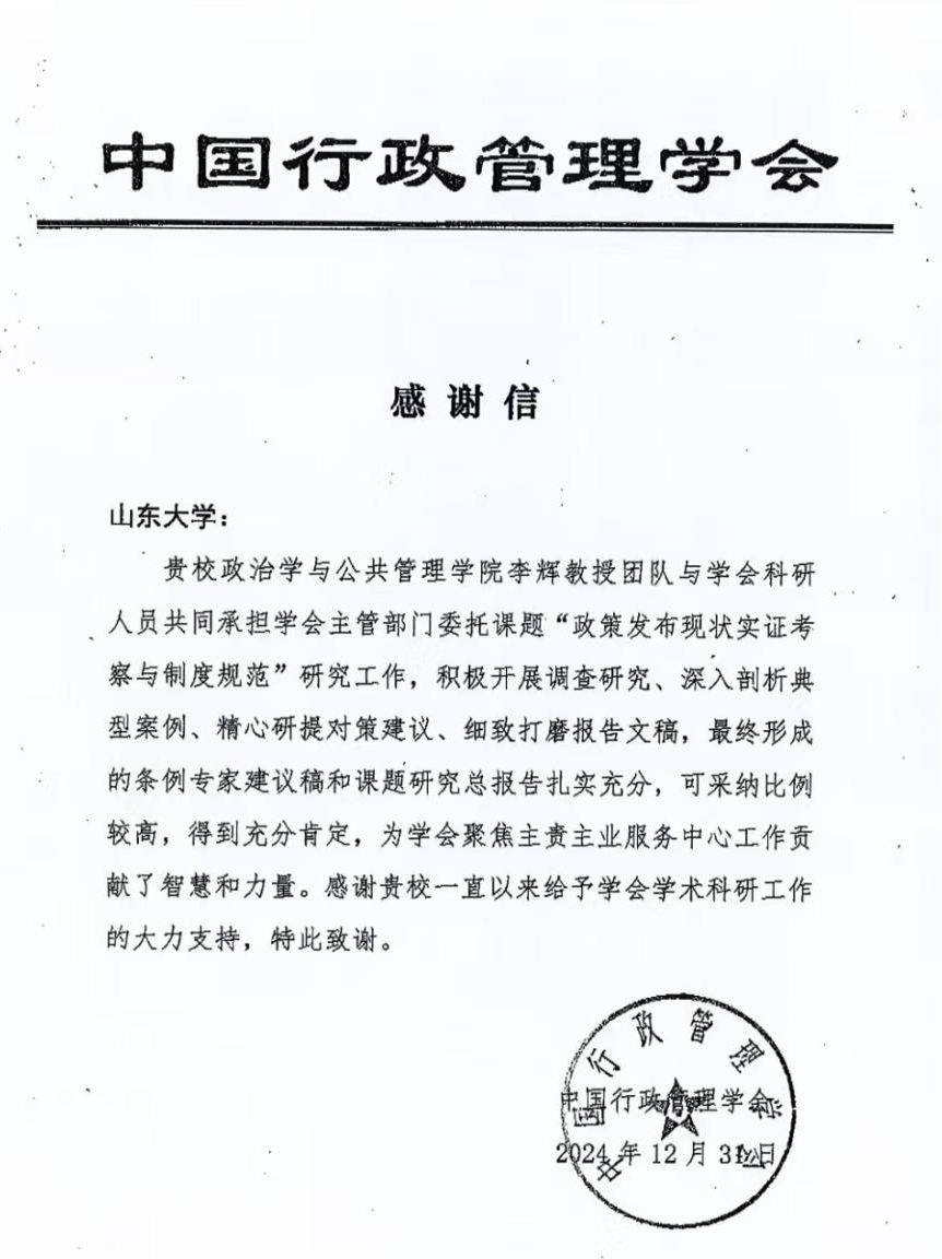 2024年12月31日,滚球买球的app官网收到中国行政管理学会发来的感谢信。信中对学院李辉教授及其团队为学会承担主管部门科研课题做出的突出贡献表示充分肯定和感谢。
