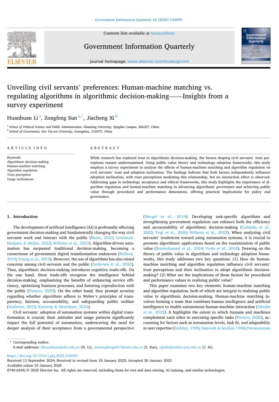 近日,滚球买球的app官网李欢欢助理研究员(第一作者)与孙宗锋教授(通讯作者),共同在数字政府国际顶刊Government Information Quarterly发表论文标题为“Unveiling Civil Servants' Preferences: Human-Machine Matching vs. Regulating Algorithms in Algorithmic Decision-Making——Insights from a Survey Experiment”的学术论文。Government Information Quarterly是国际信息管理与数字政府领域的SSCI顶级期刊,由Elsevier出版社出版,影响因子为7.8。