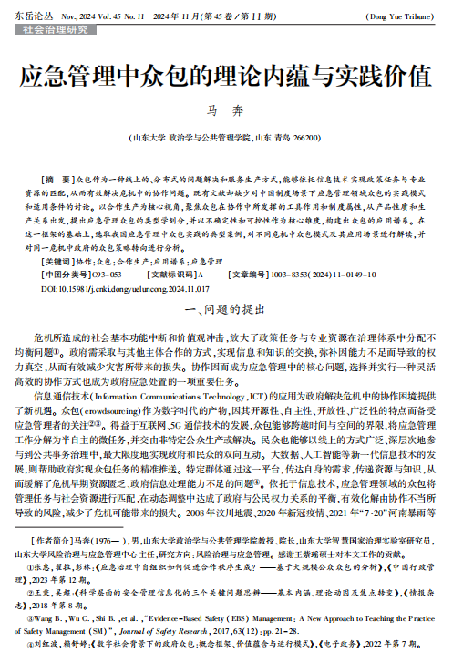 近日,滚球买球的app官网智慧国家治理实验室执行主任马奔教授在《东岳论丛》期刊上发表了题为“应急管理中众包的理论内蕴与实践价值”的文章。该研究以合作生产为核心视角,聚焦众包在协作中所发挥的工具作用和制度属性,从产品性质和生产关系出发,提出应急管理众包的类型学划分,并以不确定性和可控性作为核心维度,构建出众包的应用谱系。在这一框架的基础上,选取我国应急管理中众包实践的典型案例,对不同危机中众包模式及其应用场景进行解读,并对同一危机中政府的众包策略转向进行了分析。