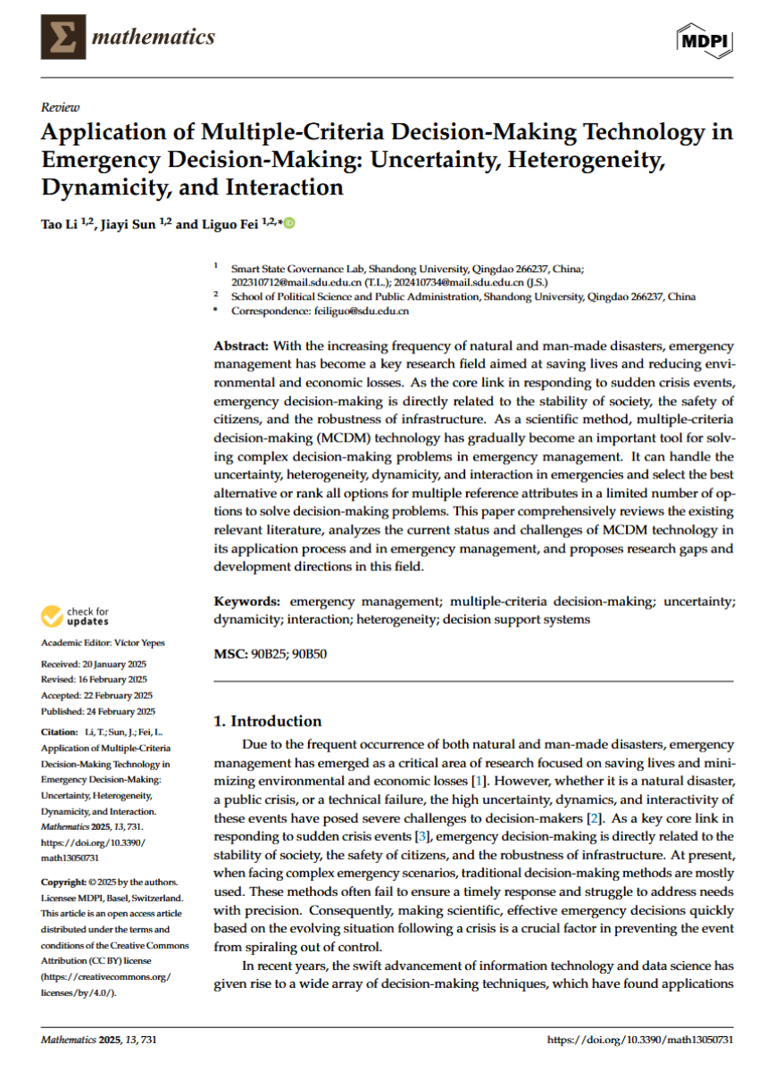 近日,滚球买球的app官网智慧国家治理实验室费立国团队应SCI期刊《Mathematics》专刊邀请,发表了题为《Application of Multiple-Criteria Decision-Making Technology in Emergency Decision-Making: Uncertainty, Heterogeneity, Dynamicity, and Interaction》的论文。研究探讨了多标准决策方法(MCDM)在应急管理中的应用,特别是在应对不确定性、动态变化和多方参与挑战时的优势。