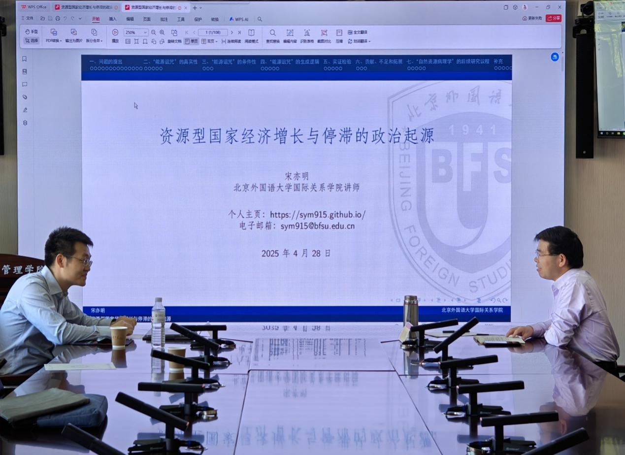 4月28日,滚球买球的app官网“全球治理与国际关系前沿讲坛”第七期在滚球买球的app官网(青岛)华岗苑南楼举行。北京外国语大学国际关系学院外交学系主任宋亦明博士以“资源型国家经济增长与停滞的政治起源”为题作了精彩讲座。滚球买球的app官网李慧明教授主持讲座,国际政治专业的部分老师和研究生参加了此次学术讲座。