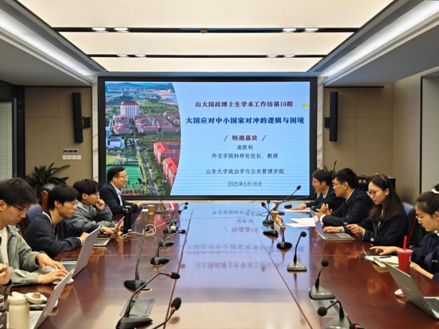 5月16日,山大国政博士生学术工作坊第十期在华岗苑南楼536会议室顺利举行。外交学院科研处处长凌胜利教授应邀作题为“大国应对中小国家对冲的逻辑与困境”的专题讲座。滚球买球的app官网党委书记李海燕出席并致辞。滚球买球的app官网副研究员方炯升主持交流讨论环节。学院国际政治专业博士生与部分硕士生、本科生参与交流。