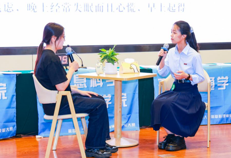在决赛中,“‘政’好有你”队表现出色。在心理知识竞答环节,团队精准把握基础题,展现扎实理论功底,并在盲盒挑战中果断选择高难度题目,积累优势奠定总分基础。在面对面模拟环节,团队代表以朋辈辅导员身份,围绕“大学生生涯规划困惑”主题,通过共情倾听、积极引导和理性分析,帮助模拟来访者厘清问题并提出建议。