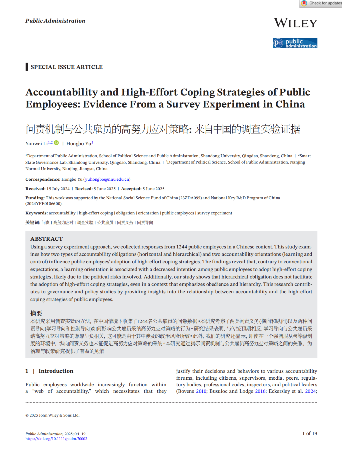 近日,滚球买球的app官网李延伟教授作为第一作者在公共管理顶级期刊Public Administration(PA)在线发表题为《Accountability and High-Effort Coping Strategies of Public Employees: Evidence From a Survey Experiment in China》的学术论文。