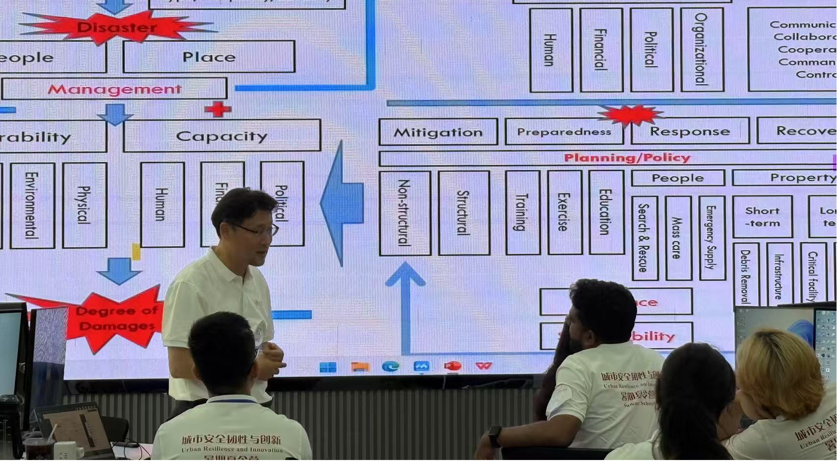 韩自强教授对授课教师、课程安排进行了详细的介绍。他强调,本次活动有助于搭建应急管理领域青年协作网络。任课老师详细介绍了自己的研究领域,每一位学员也通过自我介绍来加深对彼此的了解,相约在接下来的学习中共同探索、共同进步。在下午的课程中,Dong Keun Yoon教授围绕“灾害管理与风险分析”主题进行讲授,同学们踊跃提问、积极参与。