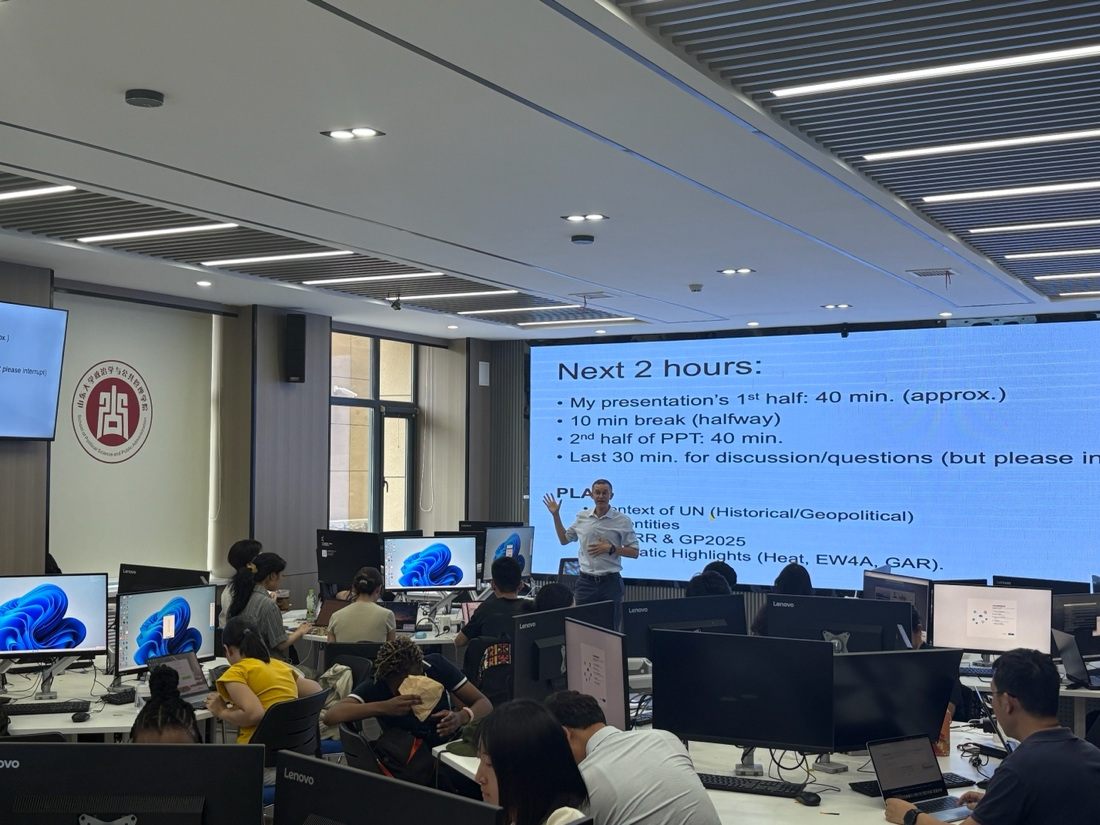 本次讲座分为两个部分,在第一部分,Justin Veuthey博士介绍了联合国这一重要的全球治理组织的发展历程和组织机构,其中重点介绍了减防灾机构以及减防灾工作的演变。在第二部分,Justin Veuthey博士介绍了2025年全球减灾平台和全民早期预警倡议的详细内容。随后,在场师生围绕应急管理中的青年行动等议题进行讨论交流。